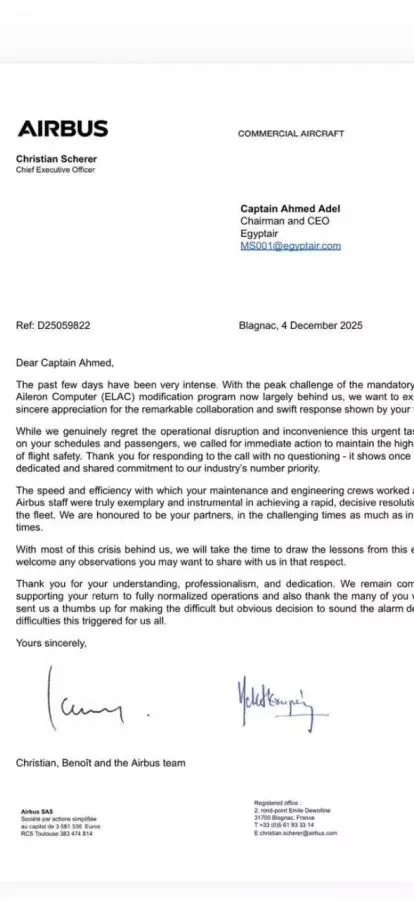 المدير التفيذى لشركة إيرباص أعرب خلاله عن شكه وإمتنان شركة إيرباص لشركة مصر للطيران مشيدا بفريق الصيانة لسرعة وإنجاز حل المشكلة الفنية التى واجهت الطائرة طراز A320 خلال الأسبوع الماضى