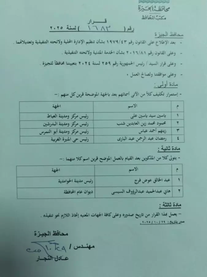 في خطوة لا يعتبرها المتابعون لأخبار محافظة الجيزة، إلا تراجعا تاما للمحافظ المهندس عادل النجار عن قراره، الذي اتخذه، قبل شهرين بتعيين بعض رؤساء الأحياء وفقا لما رآه مناسبا لمحافظته، إذ اعترض في نفسه على ما جاءت به حركة المحليات التي أصدرت ها وزارة التنمية المحلية، في ذلك التوقيت وقرر عدم تنفيذها والإبقاء على كل رئيس مدينة، في موقعه، الحفاظ على الاستقرار النسبي الذي تشهده المحافظة، خاصة مع افتتاح المتحف المصري ودخول انتخابات مجلس النواب في ذلك التوقيت، فأصدر النجار، حركة تنقلات داخلية أعقبت حركة الوزارة بنفس اليوم،