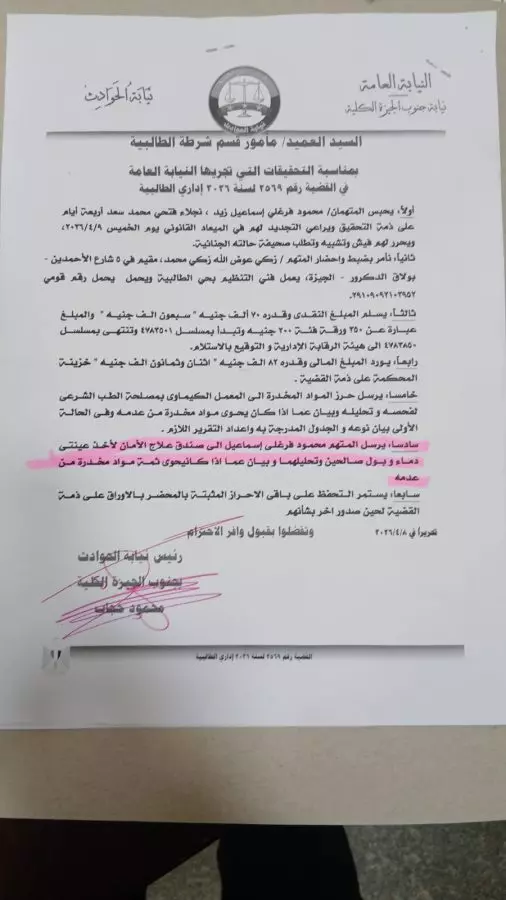 كما قررت النيابة إرسال المواد المخدرة المضبوطة إلى المعمل الكيماوي بمصلحة الطب الشرعي لتحليلها، مع عرض المتهم على الطب الشرعي لأخذ عينات، لبيان مدى تعاطيه للمواد المخدرة.